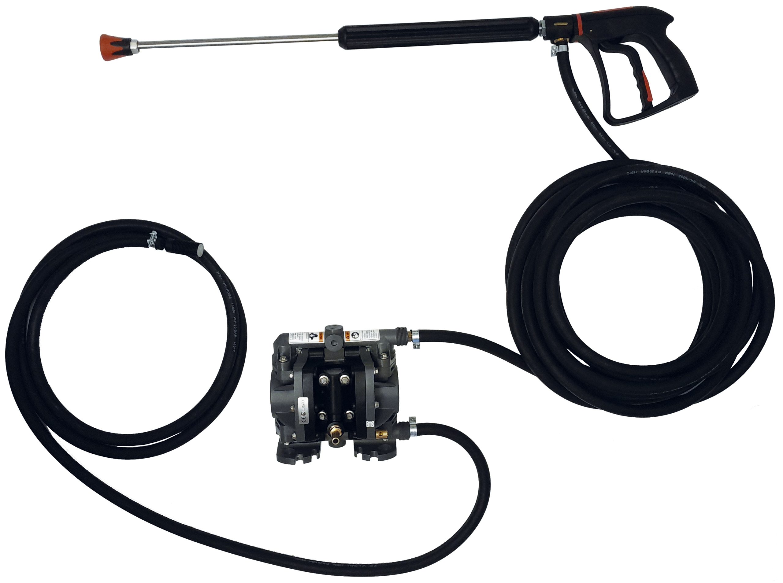 Kit ”Proffs” levereras komplett med pump, 600 mm pistolhandtag, sugfilter, slangkopplingar och 12 meter slang vilket kan fördelas som man vill mellan sugslang och avtappning.